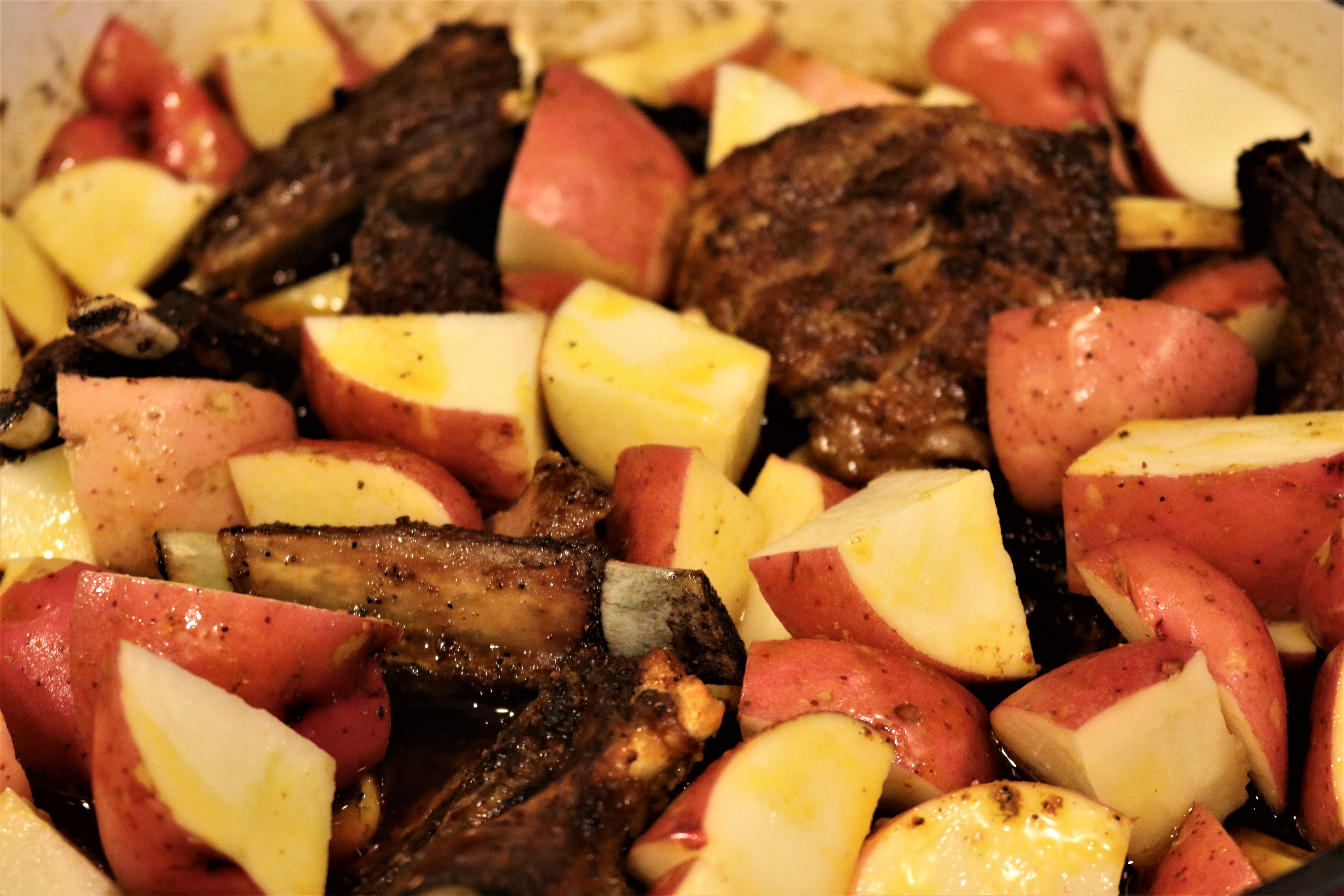 The last 40 minutes remove the lamb from the oven, uncover and add the potatoes after discarding the water… try to nestle them between the lamb to soak up the flavors of the spices.